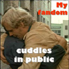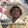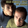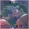 Description: Kirk and Spock, heads together in a pose that looks like they're about to kiss, captioned "My fandom invented slash".