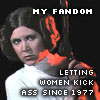 Description: Princess Leia, highlighted with red, captioned "My Fandom: Letting Women Kick Ass Since 1977."